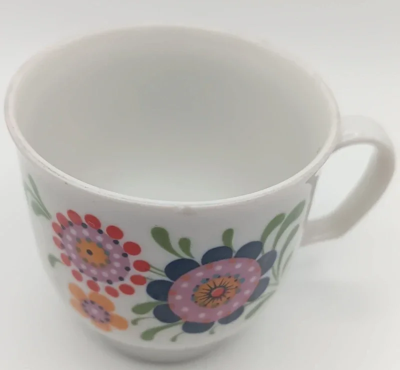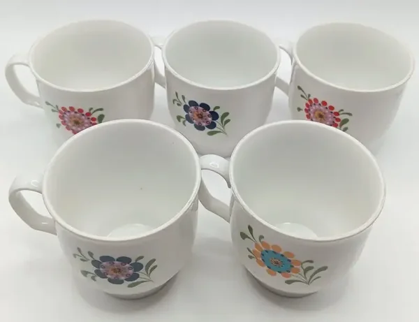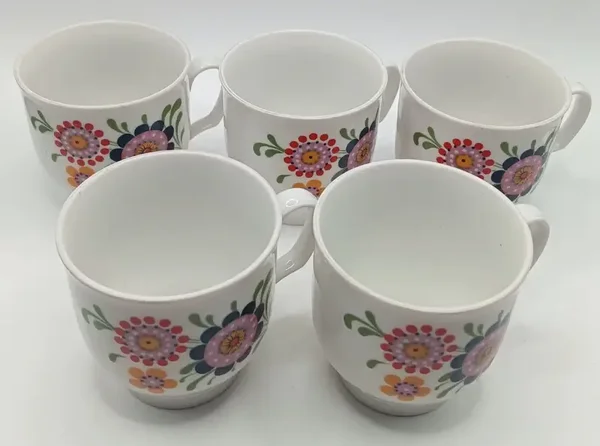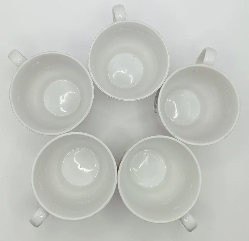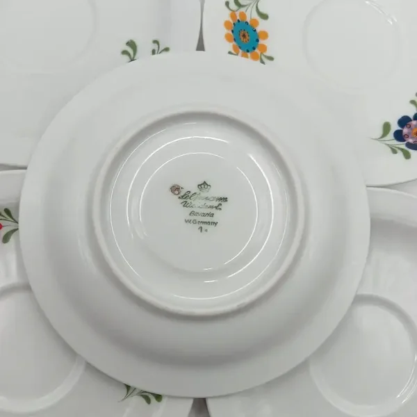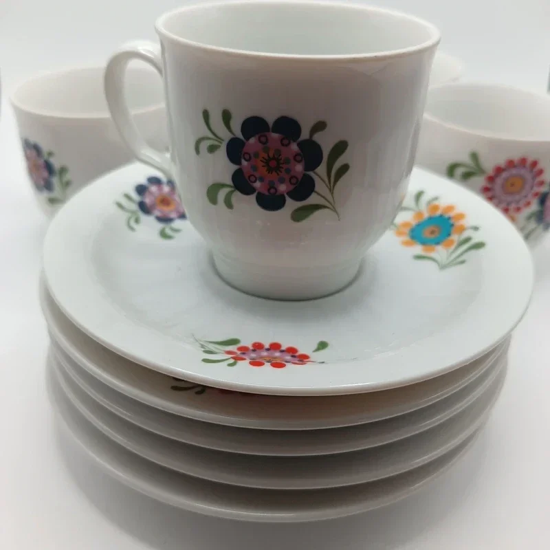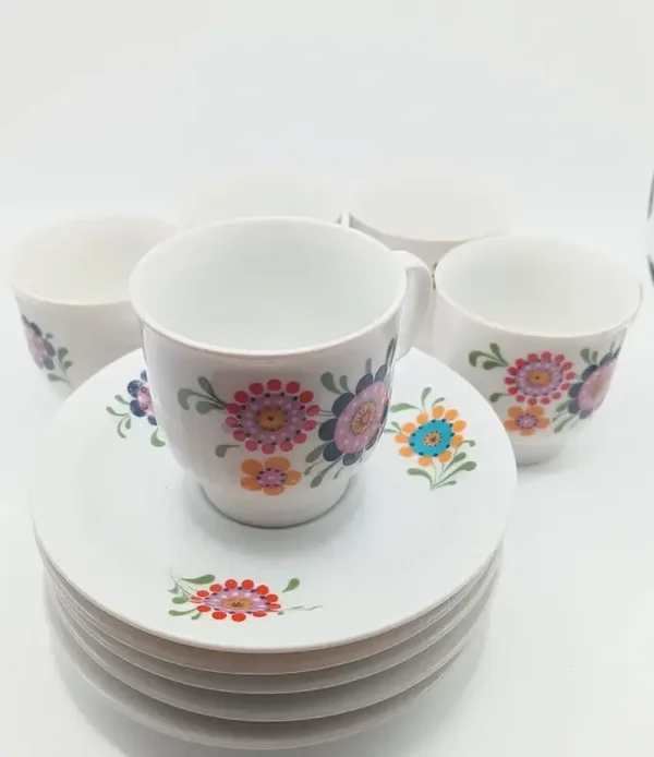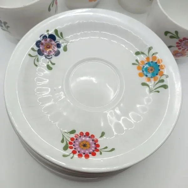 Très bon état excepté un petit éclat, très léger sur le rebord de deux tasses (voir les deux dernières photos) Aucun manque au niveau des motifs.