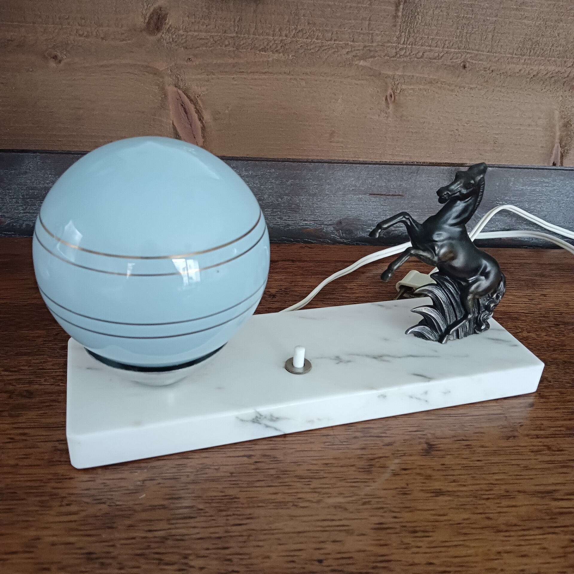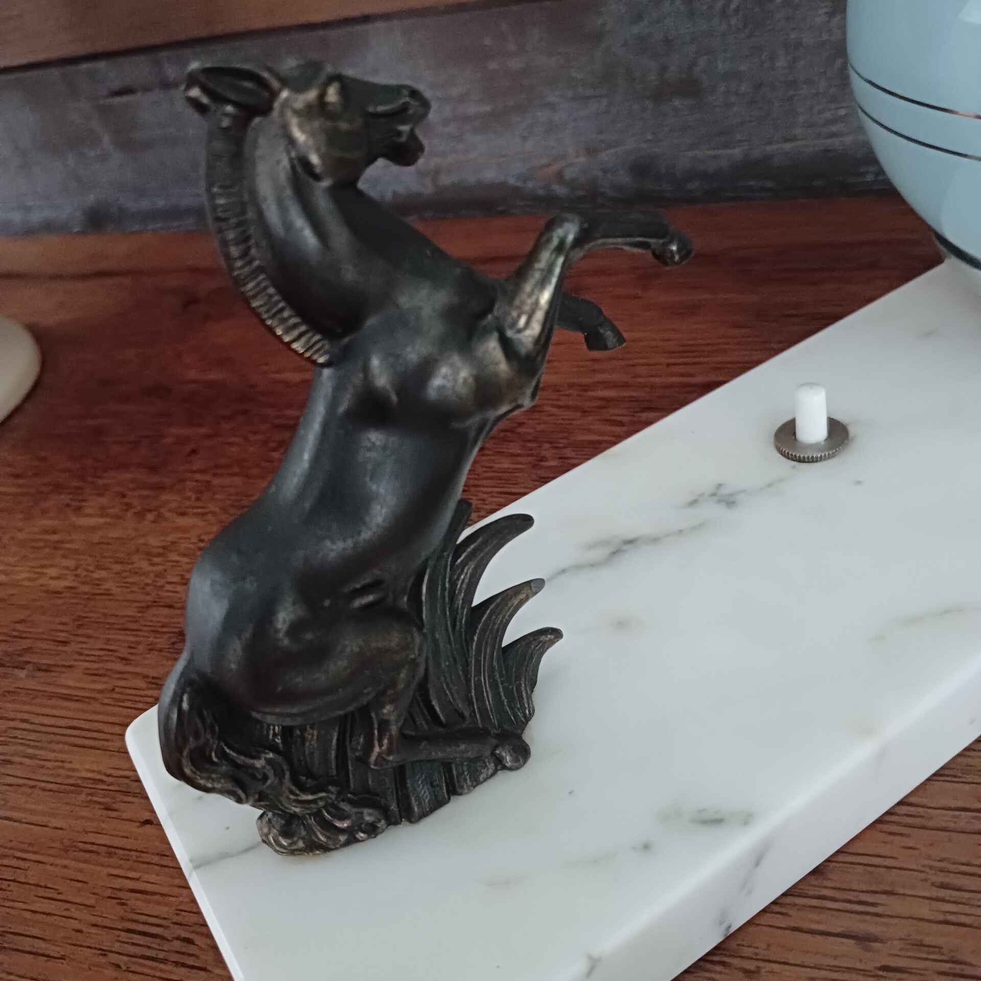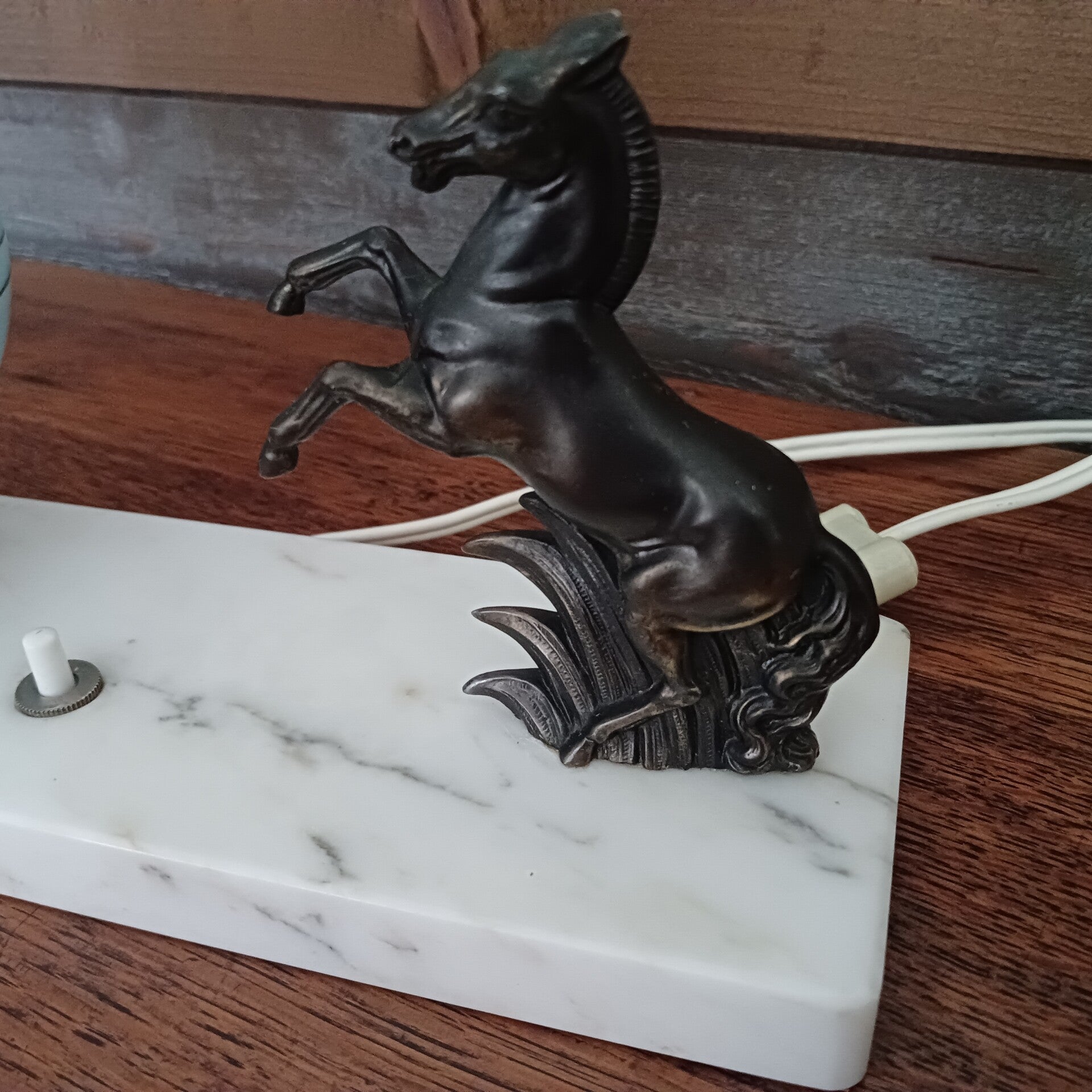 La statue de cheval en régule est posée sur un socle en marbre blanc finement veiné