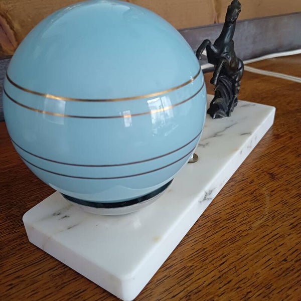 L'abat-jour est en verre teinté bleu avec des lignes dorées. De forme sphérique amovible, il est fermement tenu par deux bras plats équipés de ressorts métalliques.